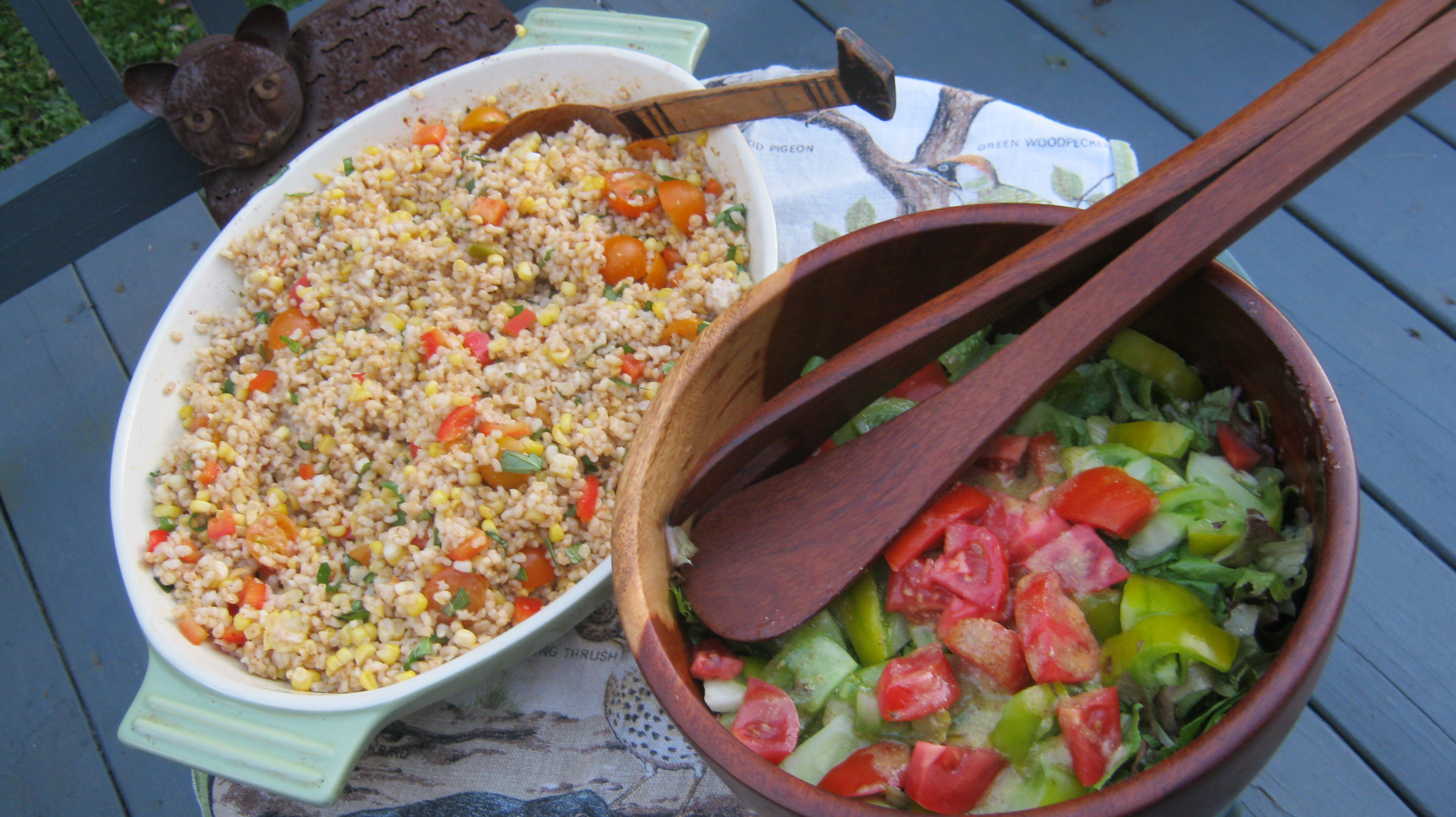 • Brown rice, local corn, homegrown gold cherry tomatoes, and homegrown basil salad