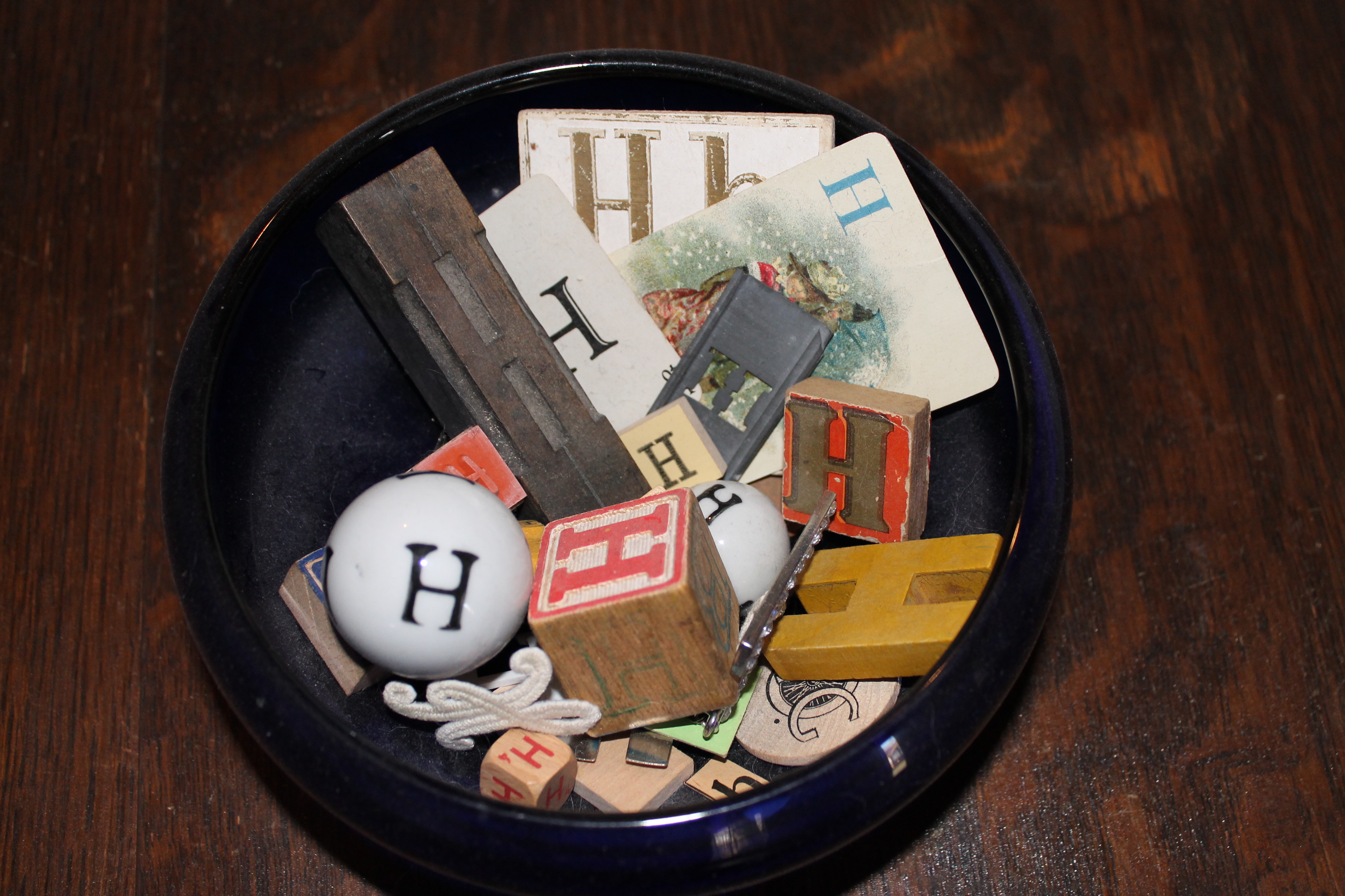 I think we’ll be downsizing soon but I want to keep collecting something. A friend of mine suggested collecting the letter “H” a few years ago. They fit in a bowl. They are fun to search out in antique stores, thrift shops, and at yard sales. They’re small enough Bob doesn’t mind them or at least not out loud.