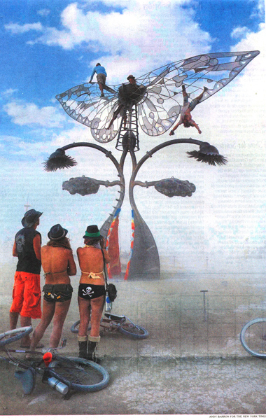 sculptures arrayed in the desert, the art cars, fire belching (mechanical) dragons, the costumed (and occasionally buck naked) denizens on the “playa,” and the whole mind-blowing scene, including the burning
