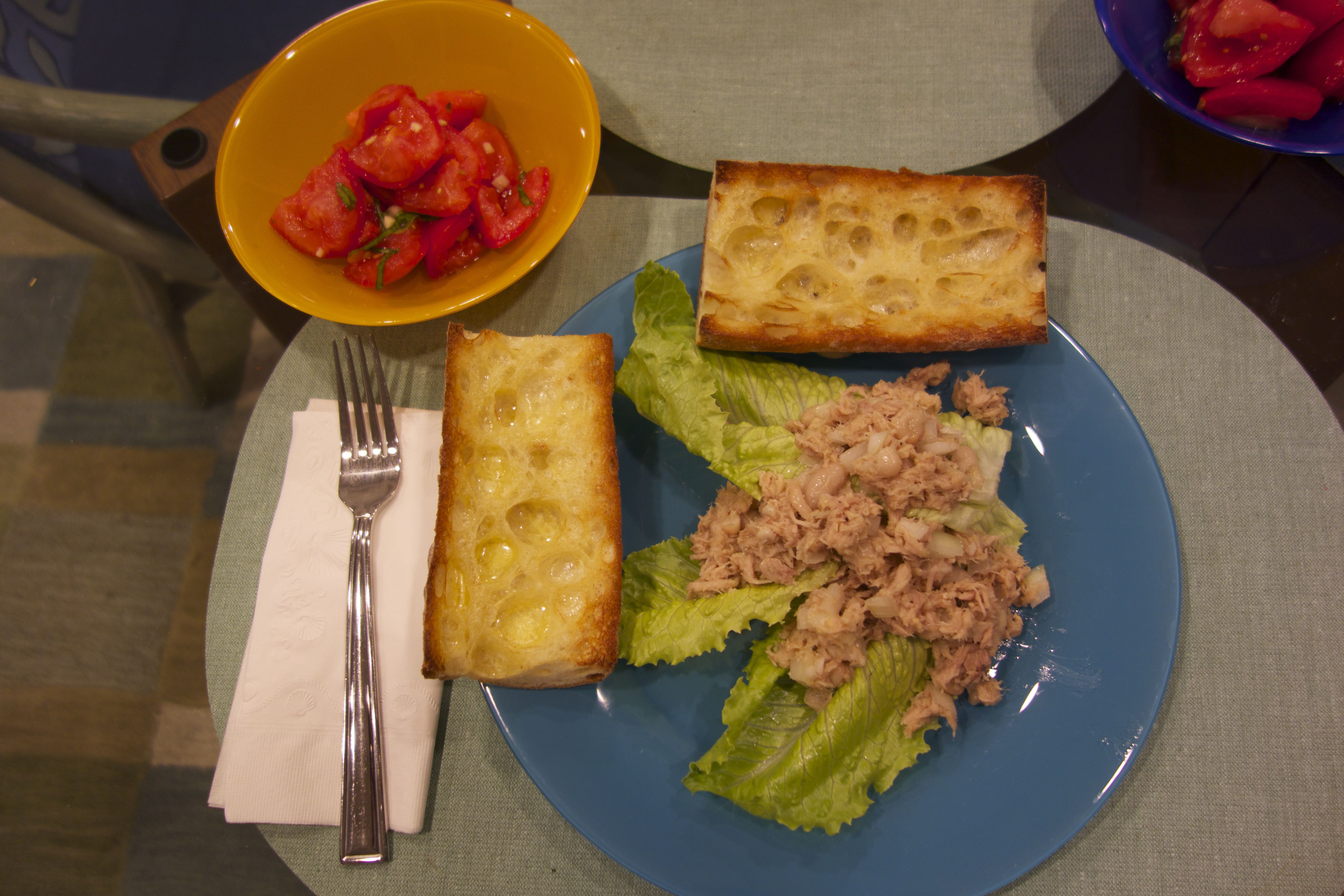 Barb: My husband has made this delicious Tuna and White Bean Salad for years. The recipe is in Boiled Over, the second Maine Clambake Mystery–which also contains the recipe for the Tomato Salad shown in the photo.