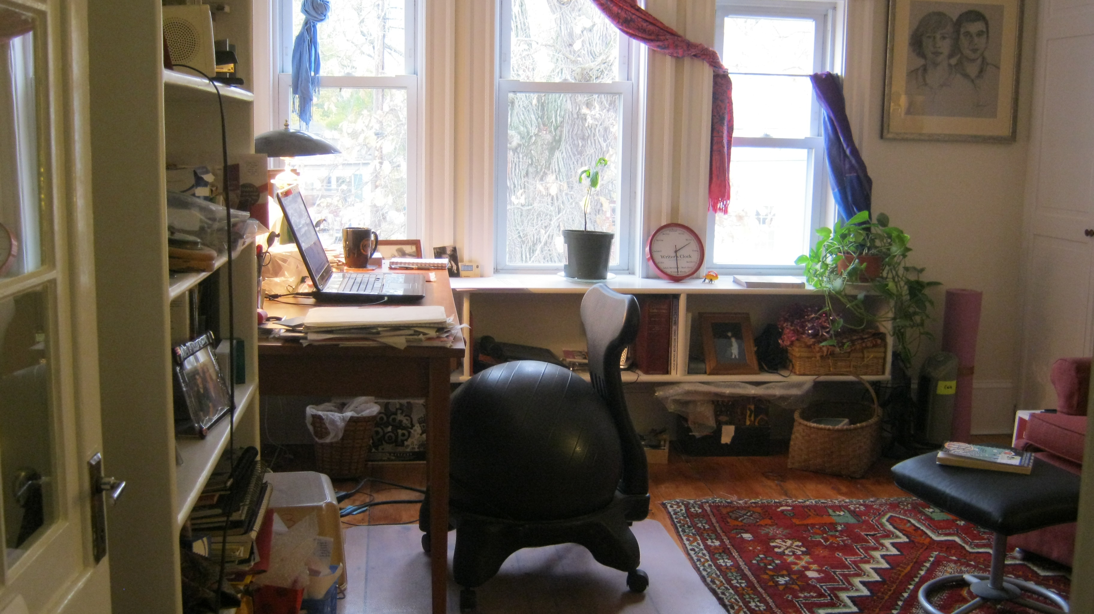 Marian Stanley here (as Mary Agnes Burke on WordPress). I have special gratitude for the big, overstuffed green armchair and ottoman where I read my newspapers and books and write in long-hand. And, oh yes, with a cup of strong coffee close by.