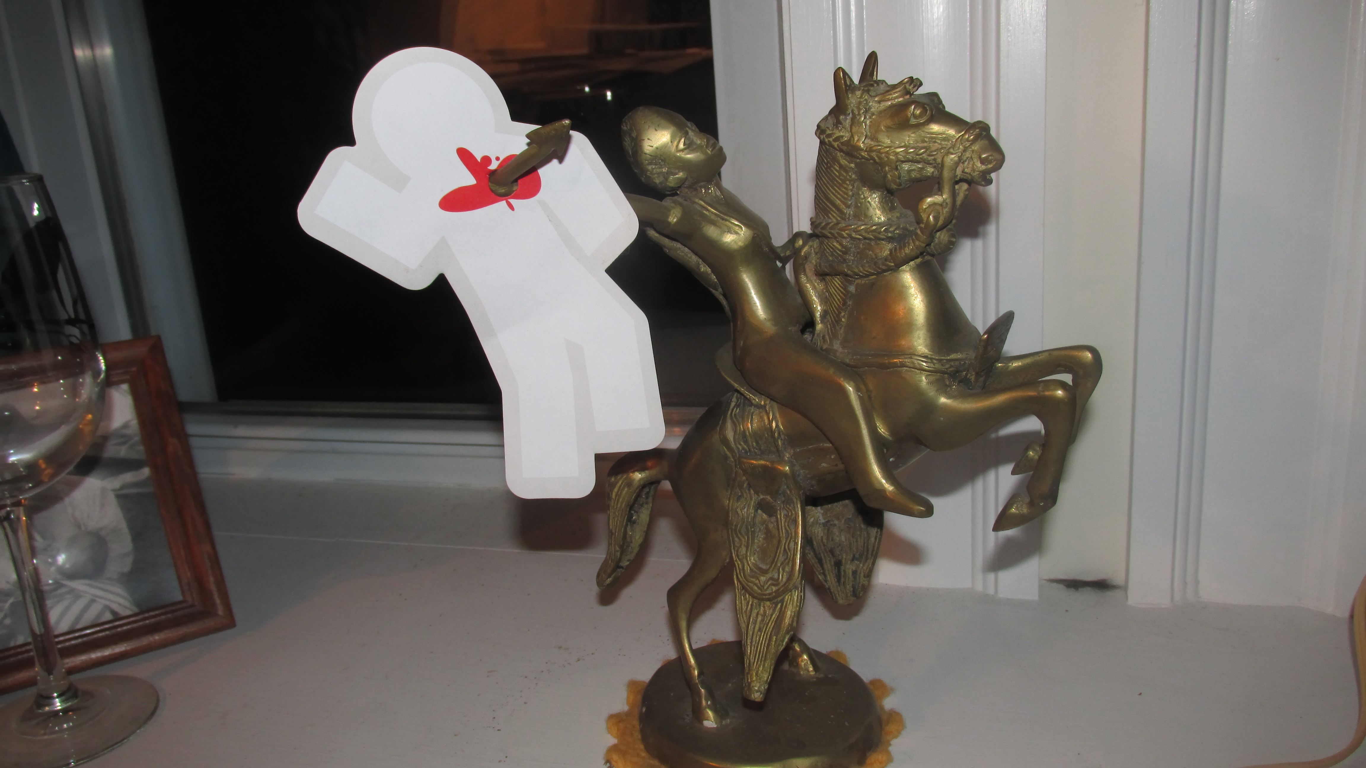 Barb: One of the figures who serve as handles for our kitchen cabinets attempts a climbing rescue of a grievously wounded Dead Fred.Edith: Dead Fred meets his end on the spear of Princess Yenenga, the fierce warrior who founded the land of Upper Volta.Edith: Hooked by the old man and woman who guard our house and our keys. Or maybe he’s just hanging with them…Jessie: Unfortunately, Fred gave the key to his heart to the wrong girl and she gave it back.Sherry: Fred made the mistake of being first in line on Black Friday.Julie: Fred meets the neighbors. Will (Shakespeare) and Tim (Gunn).