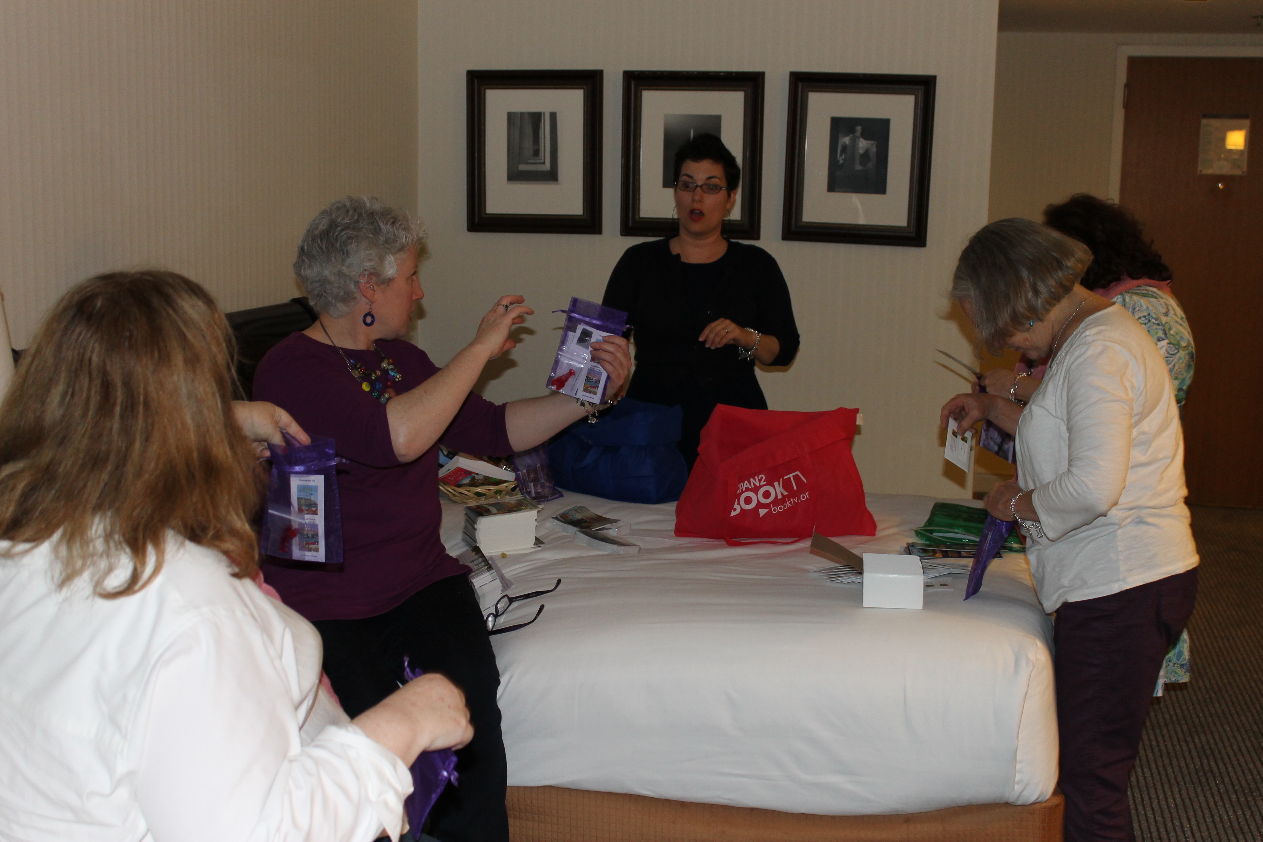 Jessie looks a little surprised as we stuff bags for the Author Go Round.