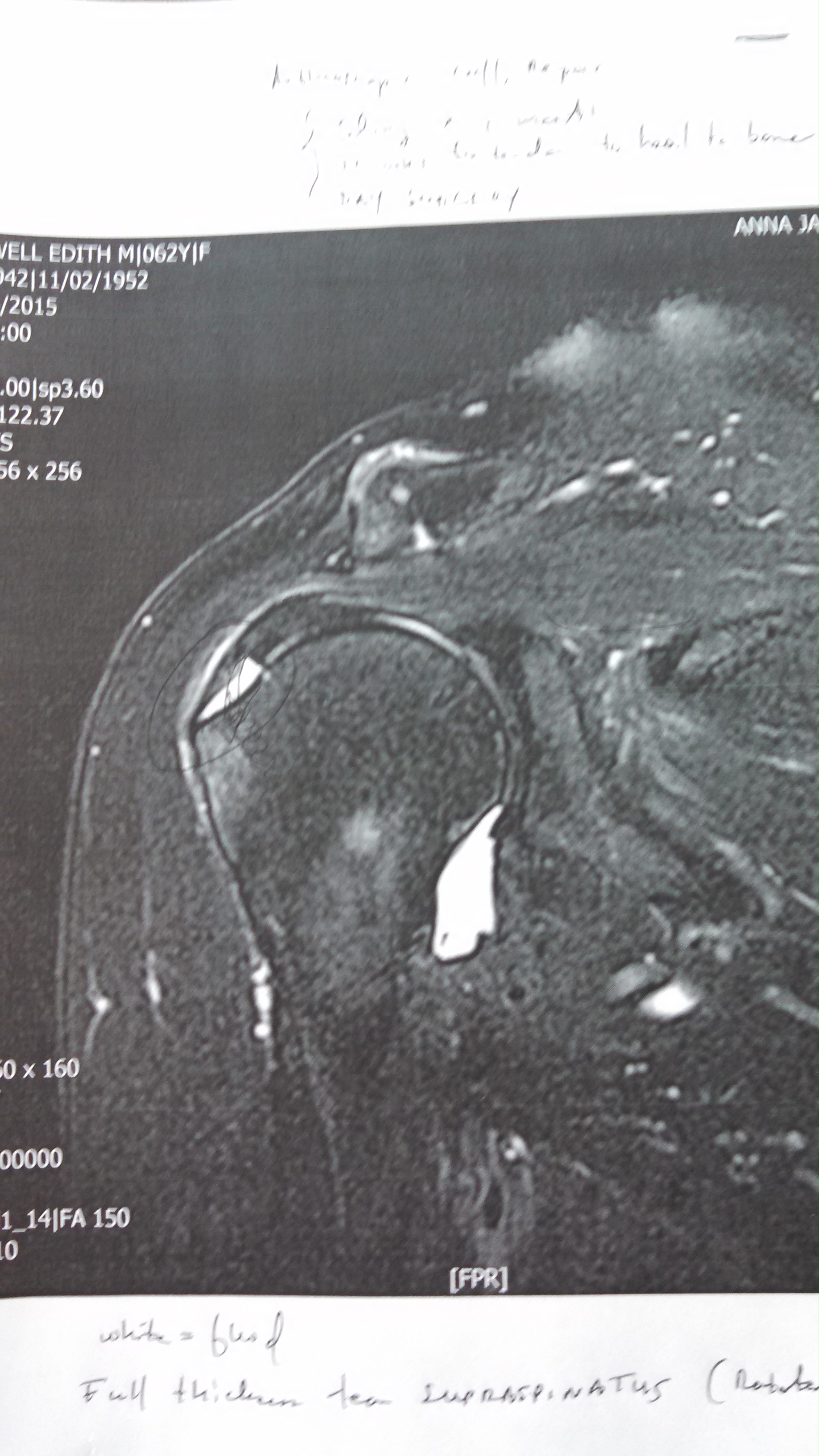 shoulderMy right shoulder has been hurting for three or  four years, and it finally got bad enough for me to get it checked out last fall. After a cortisone injection and a month of physical therapy failed to fix it, my doctor ordered an MRI. Here’s the verdict:IMG_20150302_105723_407