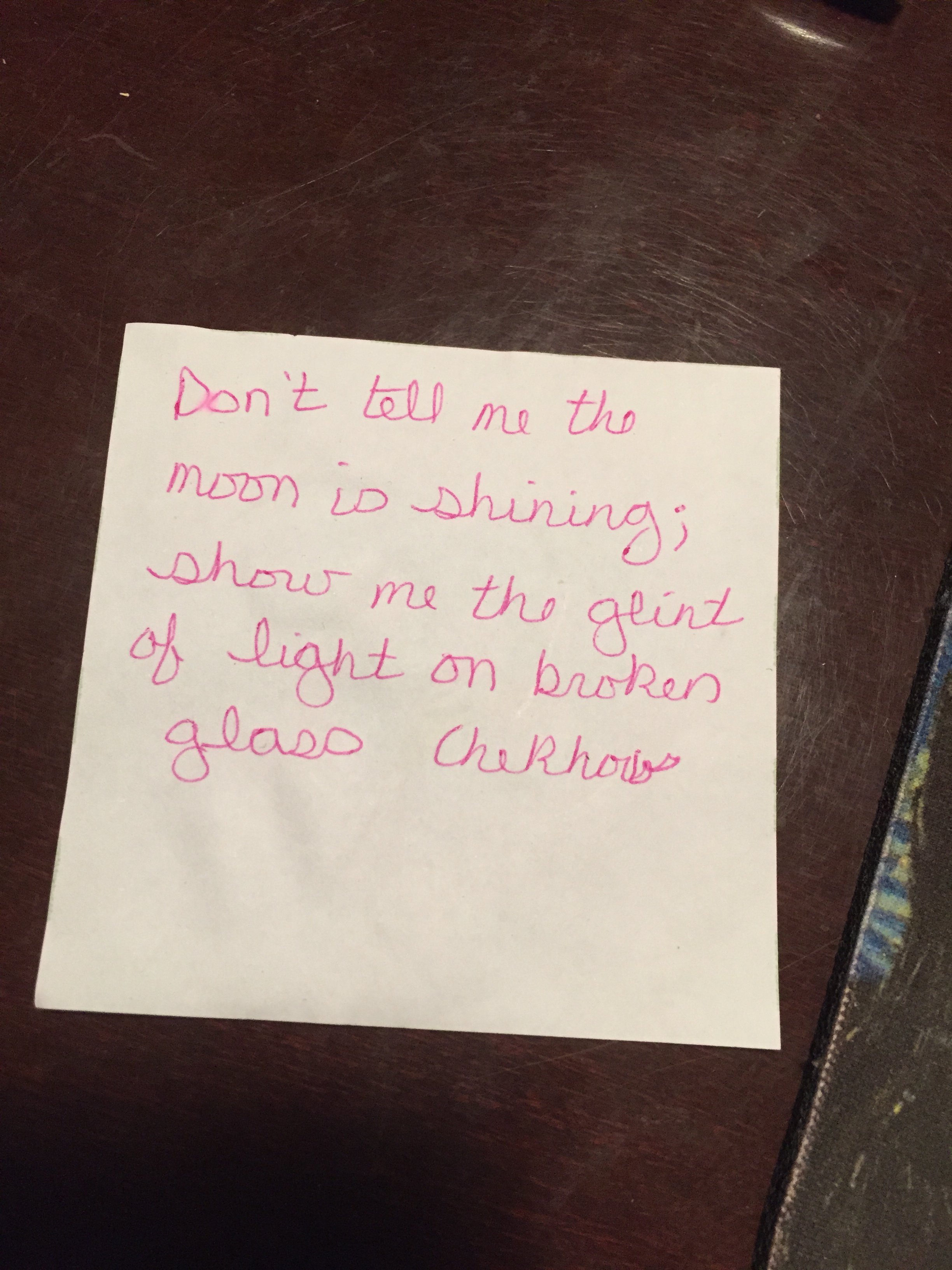 Sherry: This relates to writing and sits on my desk: “Don’t tell me the moon is shining, show me the glint of light on broken glass.” Anton Chekhov