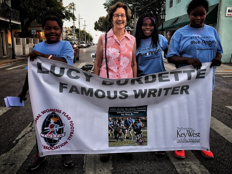 Barb: The most recent parade I went to was for the opening of the Kelly McGillis Classic International Women’s Flag Football Association Tournament. (Wow, that’s a mouthful.) Our friend, author Lucy Burdette was a speaker, along with distance swimmer Diana Nyad. When it came time for the parade, Diana got to ride in the convertible, but Lucy marched behind a sign that said, “Lucy Burdette, Famous Author,” which we, her entourage, found hilarious for some reason. But Lucy was ever the good sport.