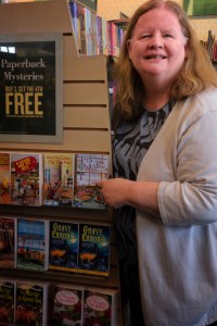 Edith: My closest B&N is in New Hampshire, and when I asked an employee where mystery section was, she led me to the cozies. I pointed to When the Grits Hit the Fan, said it was my book, and asked if she would take my picture. But the end cap was so close to a perpendicular row she couldn’t get back far enough to snap the whole thing!