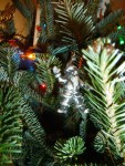 Barb: We’re away for Christmas this year, so no tree and therefore, no photograph. I’ll answer by reprising the story of Suicide Santa, the small pewter ornament who burrows so deep into the tree he gets left there, even when we search hard for him. He gets carried out to the street with the tree every year. My husband thinks he’s trying to do away with himself. I think he is merely trying to escape us. But somehow, he always gets found, even though one year it wasn’t until April when the snow melted in the yard. You can read more about his adventures here.