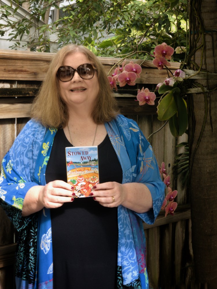 Barb: There’s only one B&N in Maine, in Augusta, not in Portland where I was last week. Now I’m back in Key West and there are no B&Ns anywhere on the Keys, so I’m posing below in our backyard with Stowed Away, which is on the display.
