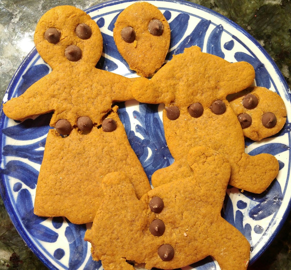 I make gingerbread men and women, using chocolate chips for eyes, noses, and buttons (and sometimes, irreverently, body parts…). We don’t frost Christmas cookies in my house.
