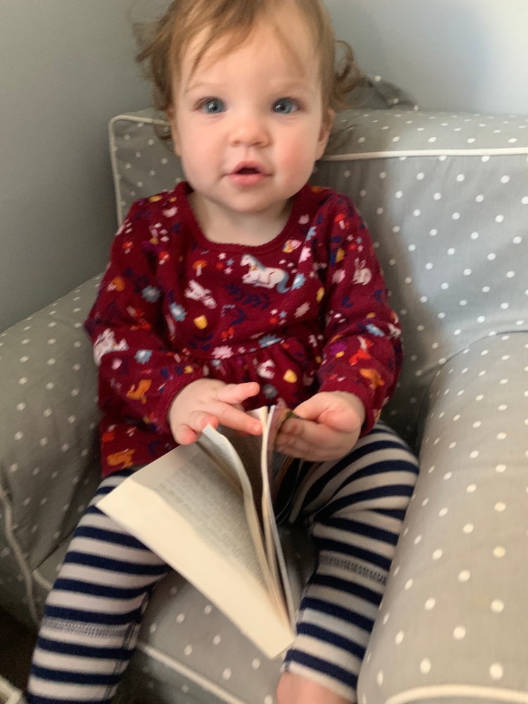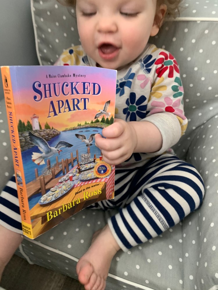 Now there’s a new baby on the scene. She was born a year ago, right after the eighth Maine Clambake Mystery, Steamed Open, was released, so she’s a little older than our previous spokesmodels. A true pandemic baby, she’s never stayed with a babysitter while her parents had a night out on the town. On the other hand, she’s extremely proficient at waving bye-bye on a FaceTime call. (Sometimes when you’re done with the call and sometimes when she decides she’s done with you.) A proficient walker, she has a little more control over her environment than previous models, so it took two photo sessions to get the shots..