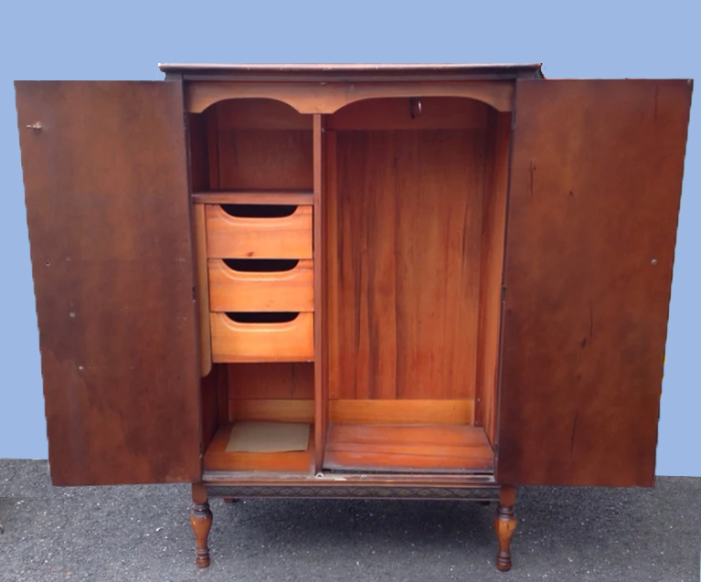 After renting a U-Haul that cost as much as the armoire to get it home, we struggled to drag it up the ninety-degree L-shaped steps to the bedroom without destroying it or the walls completely. There was blue paint on one of the legs, and a piece was chipped out of the front panel showing that the supposed wood was actually a veneer. It was short and fat so you couldn’t hang anything full length inside without it dragging on the bottom. And there were three very large drawers on one side for all the sweaters I didn’t have, making it totally impractical to hold anything other than my thin layer of socks and underwear in each.