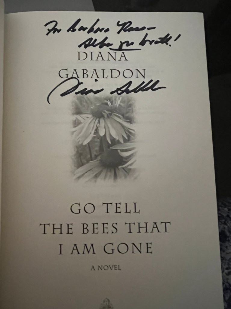 I got my book signed. The inscription says something in Gaelic. I wish I could remember what. I hope it was something about a journey or Scotland, since I blubbered that I would be there in July.