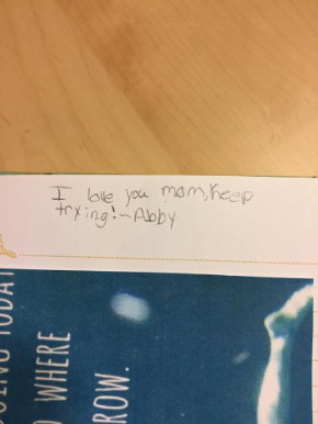 And so, I started. And in the hard times, when self-doubt raised its stupid head, the thing that kept me going was my absolute favorite quote in my Big Book of Motivation, where I stick memes, quotes, and pictures. My favorite quote isn’t Winston Churchill or Carrie Fisher, but rather, my daughter. She snuck in a little message for me to find later, in her little fifth grade scrawl atop one of the pictures: