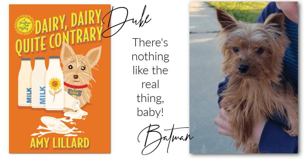 My latest mystery, Dairy, Dairy, Quite Contrary has the cutest cover with the cutest dog up front and center. In the book he’s Duke and in the dedication you can learn how he got his name. In real life, he’s Bentley, a.k.a. Batman. Batty is my younger sister’s dog. He’s the perfect sidekick for my mystery-solving, advice-giving, table-waiting heroine, Sissy Yoder. Duke (and Batman) are Yorkies. Very small Yorkies. Like three pounds of love and fur…I mean, three pounds of ferocious canine. (Well, they think they are ferocious. Who are we to tell them any differently?)