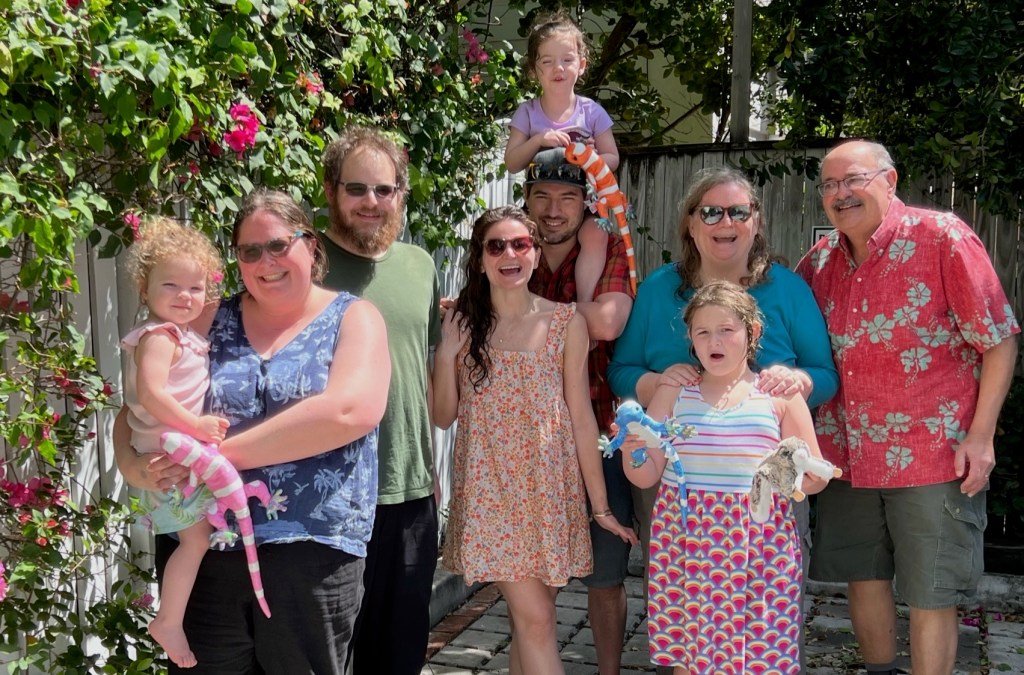 Bill and I spent January to March in Key West, and this year all the kids and grandkids were able to join us for a visit. Kate, Luke, Etta, and Sylvie, then three and two, endured a movie-worthy series of travel disasters to get there, but we were all together in the end. We were even joined by Luke’s parents, Kim and Bob, after Rob, Sunny, and Viola left. Etta and Sylvie loved being surrounded by all their grandparents.