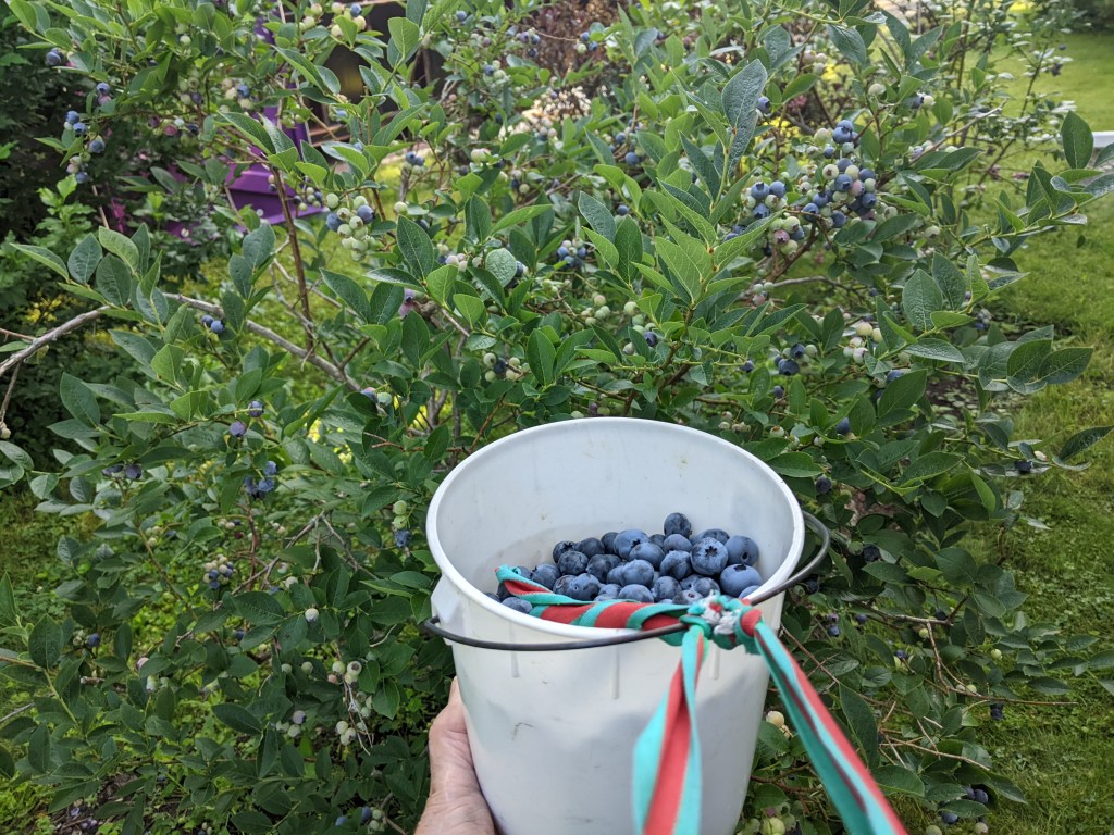 My longtime picking bucket was a pail of my sister’s Quebec honey long ago, and the ribbon lets me pick two-handed.