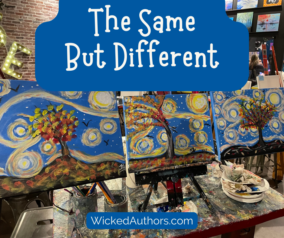 As I was painting, I couldn’t help but think about the creative process of writing. First of all, even though we had the same model painting, and the same directions, the three of us went in different directions. The same can happen with writing. If the Wickeds all had the same writing prompt, you’d read six very different stories. That’s part of the creative process. Everyone’s work is unique. And that’s wonderful.