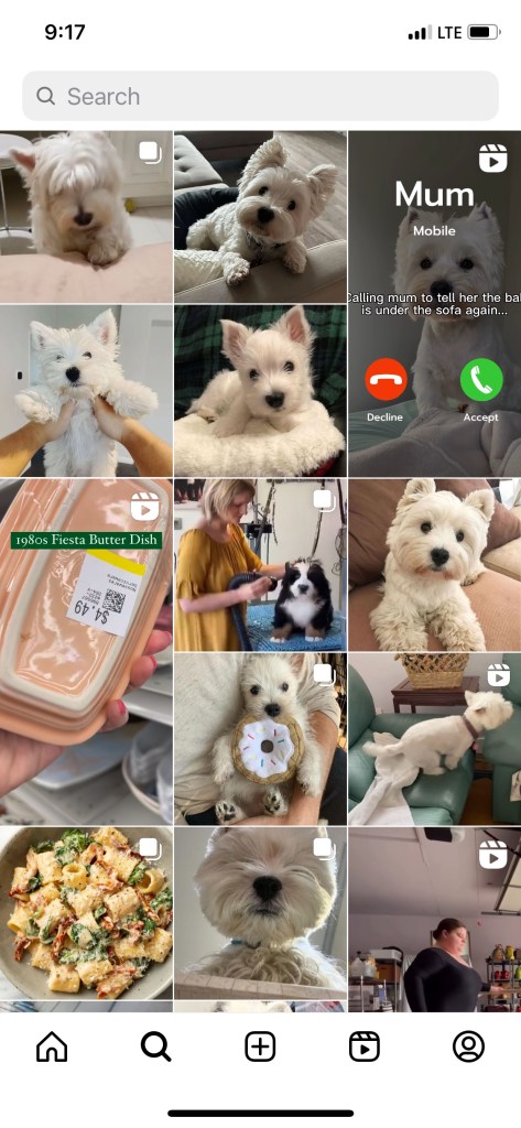 Social Media – Instagram – my feed is dogs (mostly Westies and Bernese Mountain dogs), artists—from ballet dancers to authors to musicians, chefs, and clothes designers, thrift shop finds, DIY furniture makeovers, self-defense videos and tips which I send to my daughter (I’m sure they are received with much eye-rolling but a mom’s got to do…). No politics allowed! Below is a photo of what my Instagram search page looks like when I open it.