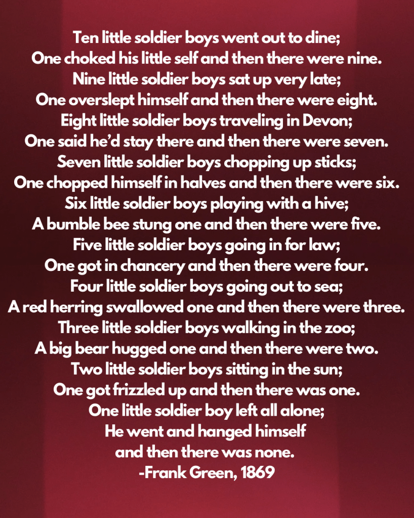 The rhyme and Christie’s novel were both originally titled Ten Little N****** Boys—yes, with the hard R—. Please remember that I said the rhyme was taught to children as an early lesson on hatred.