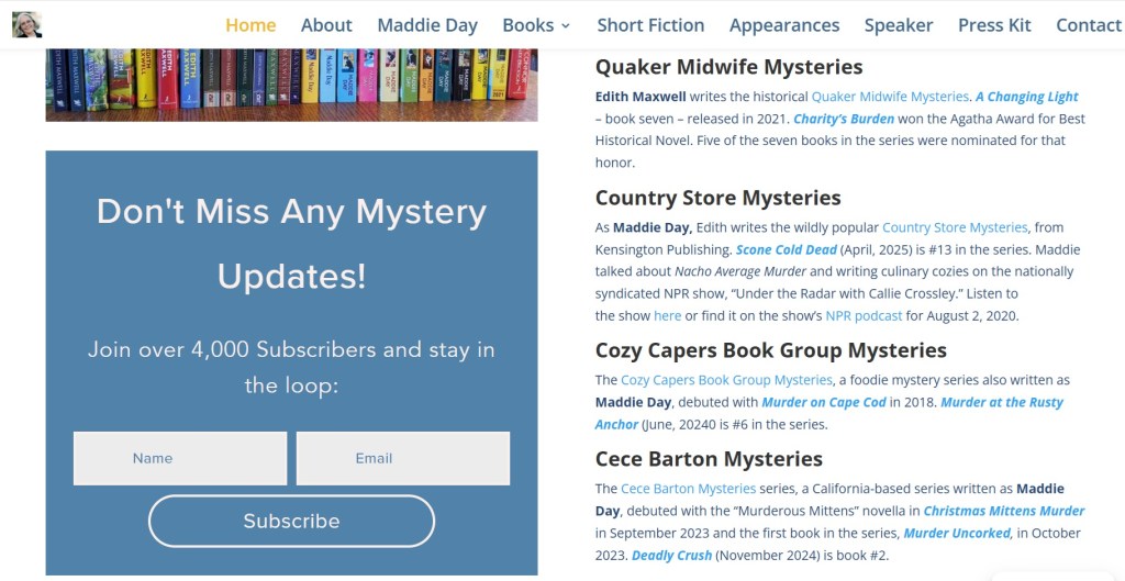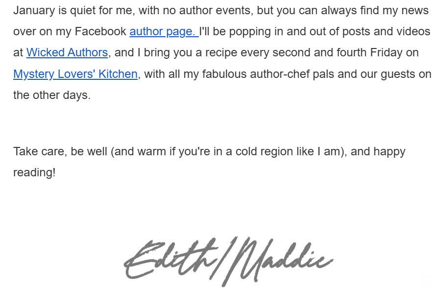 We all know how ephemeral social media is. I might think I have thousands of followers on my Facebook author page and elsewhere, but the social media owner can change that or deny access in the blink of an eye. As Julie, FOW Ellen Byron, and others have said, you OWN your email list. Subscribers have to opt in to receive our mailings. Nobody can take that away except the subscriber.