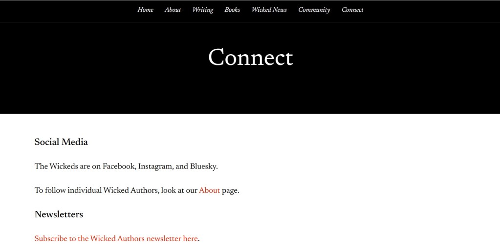 And of course you can easily sign up for the Wicked Authors newsletter here or by clicking the Contact button and then the link under Newsletters – and we hope you do.