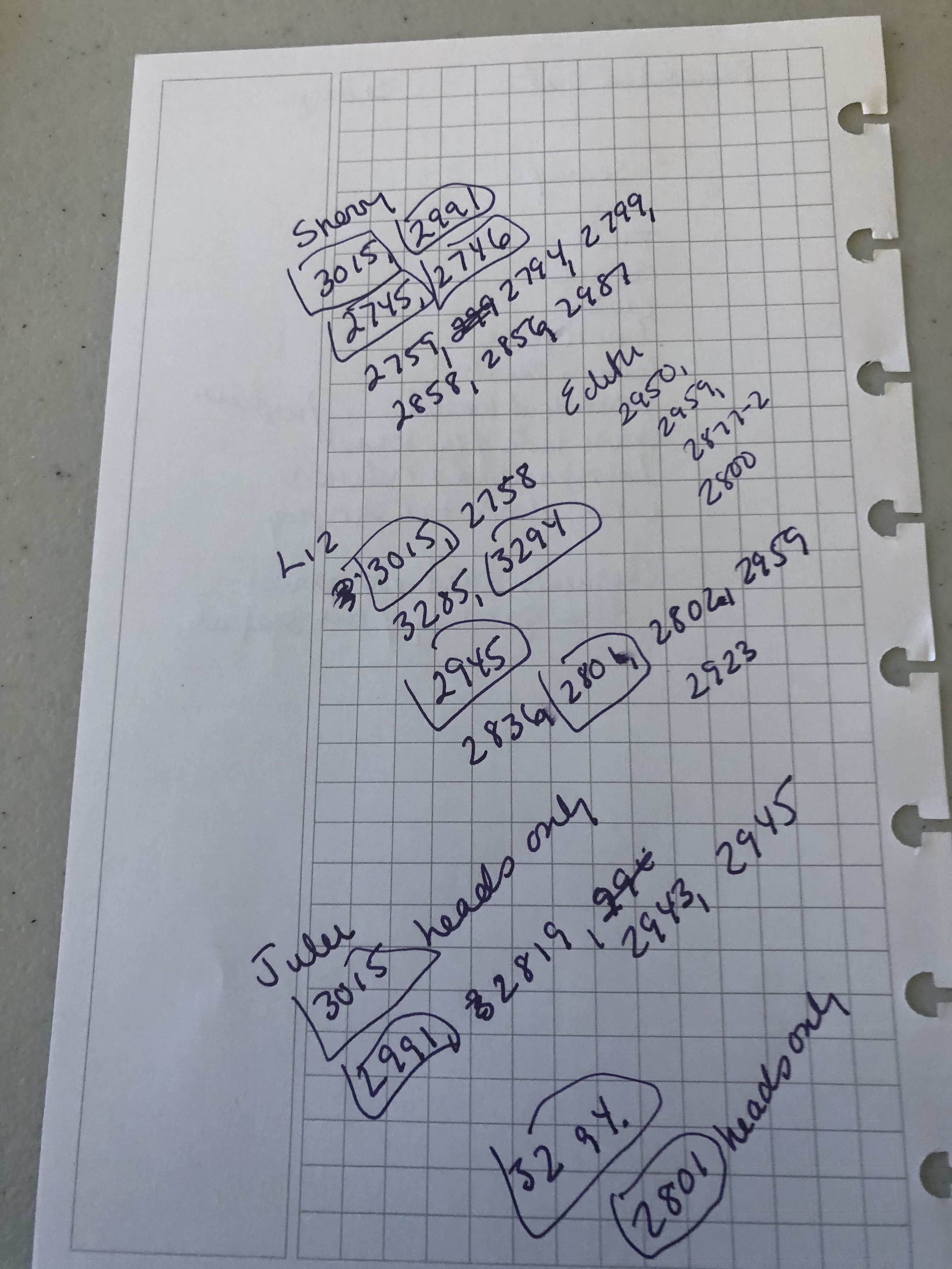 I stared and stared at these notes trying to figure out what they were about. It’s the numbers of the photos from the photo shoot that resulted in the image on the cover page of this block. I’m trying to figure out which photos are acceptable to all six Wickeds.